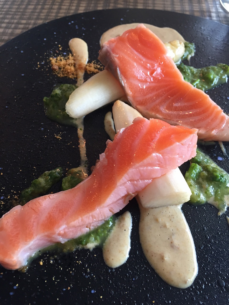 次が最初のメイン オーロラサーモンのミキュイとホワイトアスパラのソテー