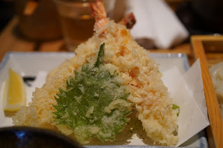 しその葉、かぼちゃ、えびてんぷら、しかもえびはとっても大きいえびが二つ。巨大なえびでした。