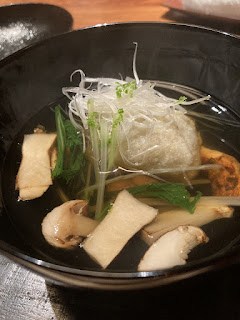 そして自慢のそばがき椀はマツタケが入っている。これは贅沢。そしておつくりは長崎県五島列島より直送のカマスサワラ。イラ、そしてクチビであります。自家製土佐醤油でいただきます。そしてこれもすごかった。子持ち鮎の美味しい塩焼き、これは最高です。そしてあっさりとしたうまみの冬瓜、香ばしい焼きナスとあわせて木庭阿知でいただきます。そしてあげたての天ぷら、高知県産の天然塩でいただきます。しいたけ、万願寺唐辛子のてんぷら、さといも、えび、どれも美味しい。最後はおそば。群馬県赤城産、てうち十割そば、最高に美味しかったですね。最後は自家製デザート、ピオーネ、羊羹、どれも美味しかったです。美味しいプリンもいただきました。最高でした。