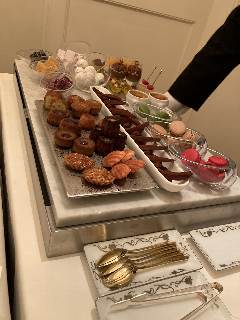 さらに次のメイン、お肉は、シストロン産仔羊コートフィレ肉のフォワイヨ風、カツレツみたいなおいしい料理でした。肉は最高にジューシー。次は塾生されたチーズ、ワゴンからたっぷり