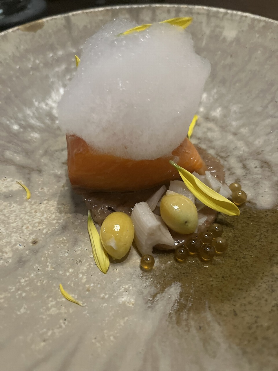 とてもおいしい。フランス料理ベースでも食材はとってもジャポンです。最高でした。まず今日はとてもおいしいコースをいただくことができました。最初にいただいたのは天草大王、そして柚子胡椒の入った最中でした。このアミューズは最高でした。そして次に出てきたのがタラです。塩漬けされたタラと白子最高においしかったです。そしてその次にいただいたのが仙台の牛タン、そして豚の端そして坂元黒酢白寿でございます。そして次は発酵、玄米です。鮭と、そして大イクラ、そして上には泡になった鮭醤油でした。最高でした。そして次にいただいたのがあんこです。あんこうの肝とそしておいしい酒粕。これは大吟醸の酒粕です。そして最強味噌これは最高でした。次はメインは江戸中でございます。とても臭みがなく、おいしいエゾジカにトリュフ醤油、そして会津の味噌漬け野菜がでした。そして最後の食事はラーメン、なんとフレンチでラーメンびっくりです。北海道の味噌とおいしい吟醸6年仕込み缶釣りです。そして金環でございます。紀州の美味しい梅、そして梅津そしてみかん甘酒で味わいが深くなっております。そして最後は柿です。おいしい瀬戸内、レモン、そしてあんぽ、柿、さらに純柿酢でございます。とてもおいしい最高のディナーでした。しかも雰囲気が正しく古民家私たちが食べた個室はまさしくこの建物が蔵であったことを思わせる作り方でありました。最高でございました。接客も良かったです。
